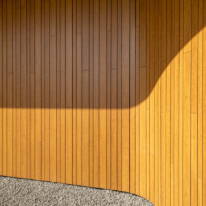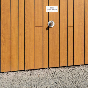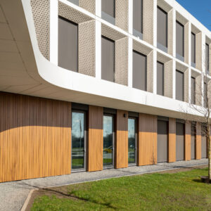 Uit het assortiment is Rockpanel Woods gebruikt in de kleur Teak. Ten Thije: “Hoewel hout was afgevallen als gevelmateriaal, wilden we het gebouw wel een echte houtlook meegeven. En dan komt er eigenlijk niets in de buurt van Rockpanel.”